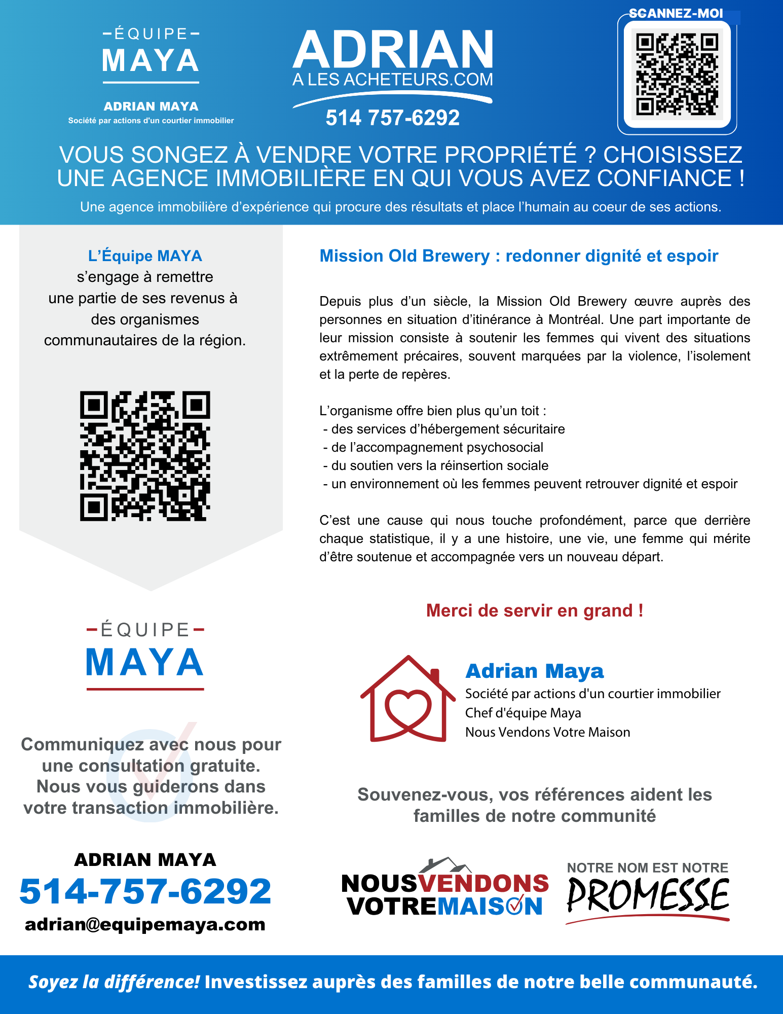 Pour chaque propriété vendue, les courtiers de l’équipe Maya et de l’agence Nous Vendons Votre Maison remettent une partie de leurs revenus à des causes importantes. Et ce n’est pas tout : nos chefs d’équipe s’engagent à doubler ces contributions!